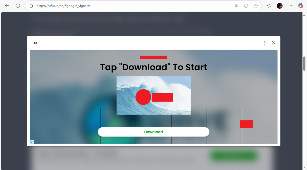 I’ve redacted the name of the product being advertised. This isn’t really about them and they may very well be legitimate advertisers. Point is, I have no idea if they’re dodgy or not. I’m here to download the Rufus app thanks very much. I’m fortunate enough to have been around long enough to recognise an ad but I wonder how someone else who might be following instructions to “Download Rufus from rufus.ie” would cope.